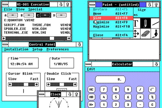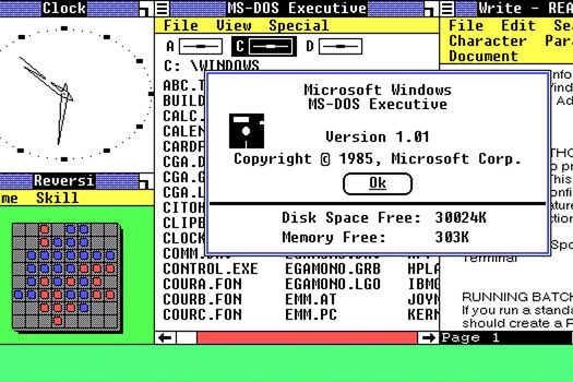 În 1985, Windows 1.0 necesita două floppy disk-uri, memorie de 256 kilobytes şi o placă grafică. Dacă utilizatorul dorea să ruleze programe multiple, atunci ei aveau nevoie de un PC cu un hard-disk şi o memorie de 512 kilobytes. Utilizatorii nu ar putea să ruleze niciun program cu o memorie de 256 kilobytes pe PC-urile actuale, dar acele specificaţii de bază au reprezentat doar începutul. Deşi Apple se detaşase ca lider, în epocă, în ceea ce priveşte interfeţele grafice activate prin mouse, compania a rămas concentrată pe combinaţia dintre hardware şi software. Microsoft crease deja sistemul low-cost PC DOS pentru PC-urile produse de IBM şi a rămas ferm poziţionată ulterior ca o companie de software.