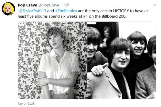 Taylor Swift şi Beatles sunt singurii artişti din lume cu cel puţin 5 albume care au stat mai multe de 6 săptămâni pe prima poziţie în Billboard 200.