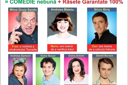 Haideţi la cea mai sărită de pe fix comedie, să râdeti în hohote alături de Alba – o maniacă a curăţeniei, care mai e şi laborantă pe deasupra (Monica Ciută), Dan – un taximetrist obsedat de calcule (Silviu Biriş), Bob – un tânăr care se deplasează sărind de pe o piesă de mobilier pe altă (Victor Bucur), Maria – o habotnică ce are şi mania verificărilor (Anca Ţurcaşiu / Andreea Mateiu), Lili – o tânăra care repetă fiecare frază de două ori (Doina Antohi) şi Fred – un individ care are ieşiri verbale şi gesturi bruşte (Mihai Gruia Sandu!).
