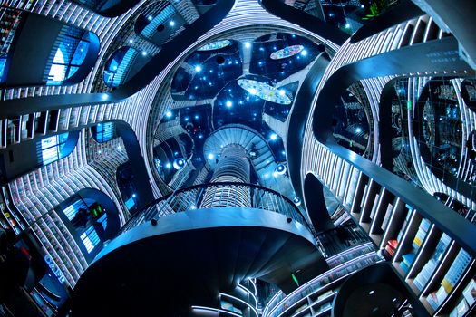 Magazinul unic în lume, care şi-a deschis uşile pe 22 noiembrie, a fost proiectat de un grup de specialişti din Shanghai, iar designul e inspirat din proiectul Dujiangyan, pentru conservarea apelor. Jocul oglinzilor este uimitor, iar efectul luminos îţi taie răsuflarea.
