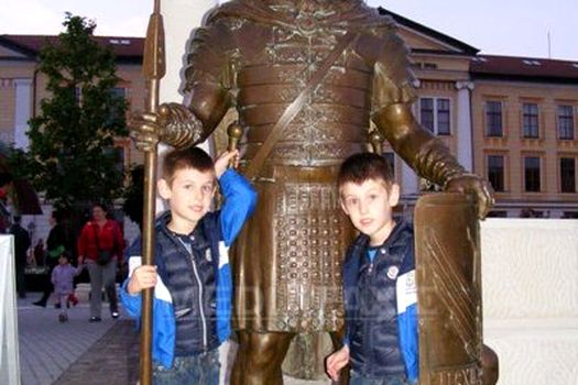 În aceeaşi zonă o familie îşi supraveghează copii care, costumaţi în soldaţi romani, se joacă pe platoul din faţa statuii lui Mihai Viteazul.
