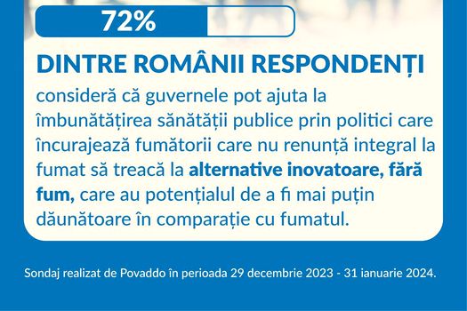 76% dintre românii respondenţi consideră că fumătorii adulţi ar trebui să primească informaţii corecte, fundamentate ştiinţific, despre produsele fără fum, care, deşi nu sunt lipsite de riscuri, reprezintă o alternativă mai bună la continuarea fumatului.