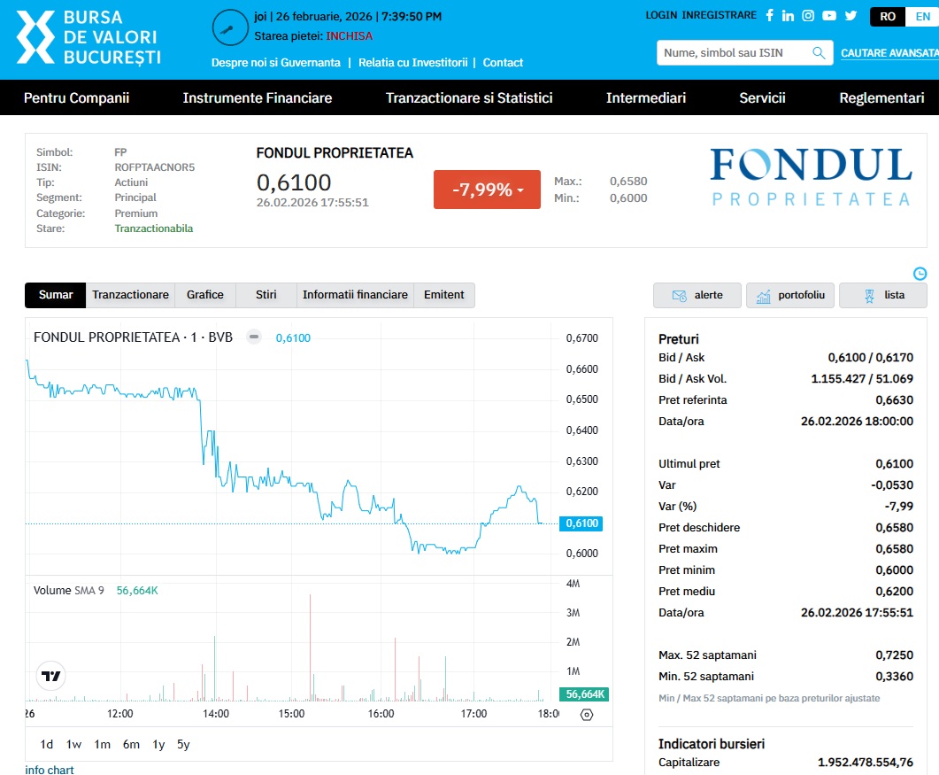 Fondul Proprietatea a sărbătorit recent 15 ani de când acțiunile sale au fost listate la Bursa de Valori București (BVB), pe Piața Reglementată, la data de 25 ianuarie 2011. De atunci și până la finalul ședinței de tranzacționare de miercuri, 11 februarie, capitalizarea bursieră a FP a depășit 2,25 miliarde de lei, au transmis adminstratorii FP și oficialii BVB, pe 12 februrarie, în cadrul unui eveniment festiv în care s-a tras clopoțelul pentru a marca aniversarea.