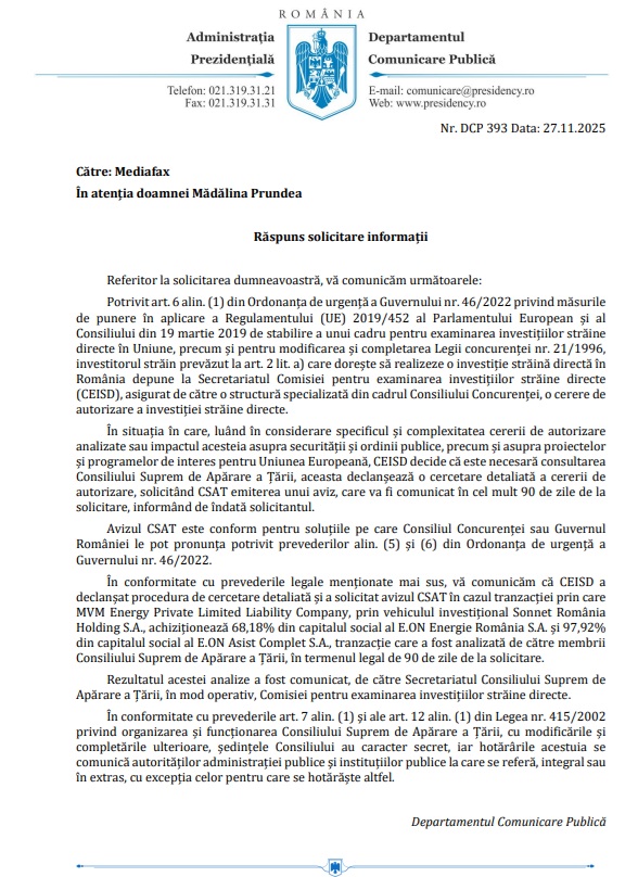 În conformitate cu prevederile legale menționate mai sus, vă comunicăm că CEISD a declanșat procedura de cercetare detaliată și a solicitat avizul CSAT în cazul tranzacției prin care MVM Energy Private Limited Liability Company, prin vehiculul investițional Sonnet România Holding S.A., achiziționează 68,18% din capitalul social al E.ON Energie România S.A. și 97,92% din capitalul social al E.ON Asist Complet S.A., tranzacție care a fost analizată de către membrii Consiliului Suprem de Apărare a Țării, în termenul legal de 90 de zile de la solicitare.