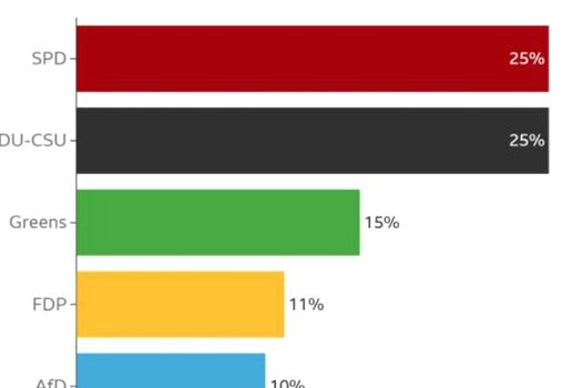 Partidul Social-Democrat (SPD, centru-stânga), avându-l candidat la funcţia de cancelar pe Olaf Scholz, a obţinut 25% din voturi, în timp ce Uniunea Creştin-Democrată / Uniunea Creştin-Socială (CDU/CSU), care îl are candidat pentru postul de cancelar pe Armin Laschet, este la acelaşi nivel (25), potrivit unui sondaj efectuat la comanda postului ARD, citat de publicaţia Bild.