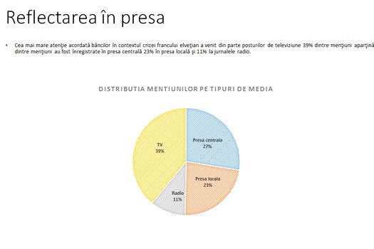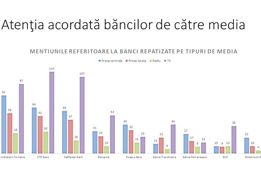 Analiza mai relevă că cea mai mare atenţie acordată băncilor în contextul crizei francului elveţian a venit din partea posturilor de televiziune 39% din menţiuni aparţinându-le, în timp ce 27% din menţiuni au fost înregistrate în presa centrală, 23% în presa locală şi 11% la jurnalele radio.