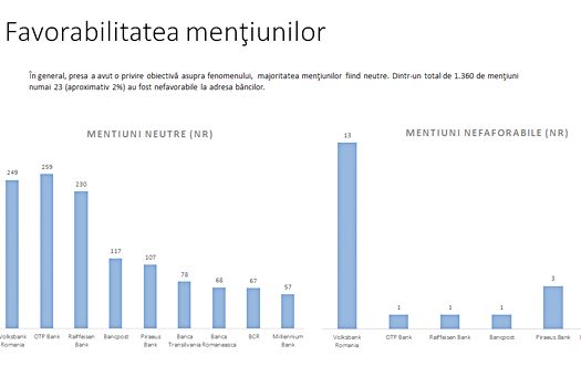 În general, presa a avut o privire obiectivă asupra fenomenului, majoritatea menţiunilor fiind neutre. Dintr-un total de 1.360 de menţiuni, numai 23, reprezentând aproximativ 2%, au fost nefavorabile la adresa băncilor. Cele mai multe menţiuni nefavorabile, respectiv 13 au fost la adresa Volksbank. La mare distanţă, cu câte 3 menţiuni nefavorabile se află Piraeus Bank şi Banca Transilvania, urmate de OTP Bank, Raiffeisen Bank şi Bancpost, cu câte o menţiune.