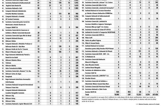 În medie, fiecare angajat la aceste companii sau regii a avut ca rezultat final o pierdere anuală de aproape 1.600 de euro în 2010. În cazul companiilor profitabile, cum este Romgaz, de exemplu, situaţia este cu totul alta. La o forţă de muncă de 5.812 de persoane, compania din Sibiu a obţinut un profit de 155 de milioane de euro, ceea ce înseamnă că fiecare angajat a adus, în medie, un profit de aproape 27.000 de euro anul trecut.