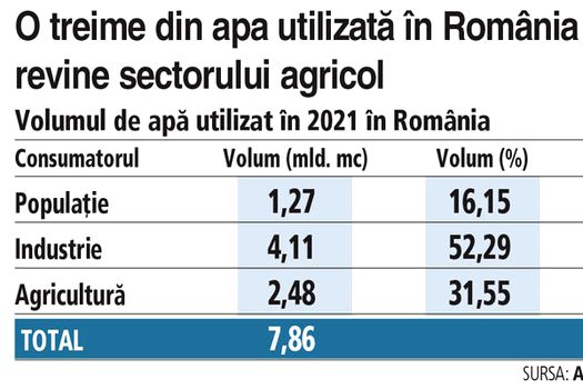 În 2021, ultimul an pentru care au date Apele Române, dintr-un total de aproape 38,35 miliarde de metri cubi de apă disponibili, au fost extraşi puţin peste de 7,86 miliarde de metri cubi de apă. Din toată această cantitate, pentru alimentarea cu apă a populaţiei s-au folosit 1,27 de miliarde de metri cubi, adică 16,15% din totalul cantităţii extrase, iar pentru agricultura a folosit 2,48 de miliarde de metri cubi, ceea ce înseamnă în procente 31,55%. Practic, agricultura a folosit mai multă apă decât populaţia şi o treime din consumul total. Spre comparaţie, în 2017, agricultura consuma doar 1,5 miliarde de metri cubi şi reprezenta puţin peste 20% din consumul total.