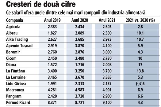 Unii dintre cei mai mari jucători din industria alimentară şi a băuturilor, printre care producătorii de carne Agricola din Bacău, Diana din Vâlcea şi Unicarm, producătorii de apă Apemin Tuşnad şi La Fântâna, dar şi producătorii şi distribuitorii de băuturi alcoolice Pernod Ricard şi Prodal 94, au planificat creşteri între 1,5% şi 20% a salariului mediu net din companie în 2021, în comparaţie cu anul trecut, potrivit calculelor ZF pe baza datelor oferite de companii pentru întomirea catalogului anual Cei mai mari jucători din economie. ZF a luat în calcul doar jucătorii care au oferit date cu privire la salariul mediu net din firmă.