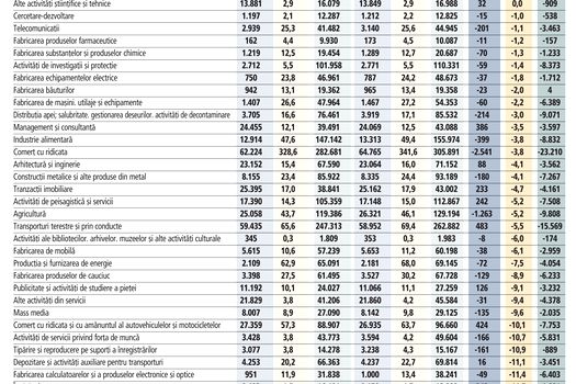 Datele arată şi că din statistici au dispărut 5.500 de firme, dar şi 300.000 de oameni. În ceea ce priveşte numărul de actori economici, cu adevărat impactul pandemiei se va vedea în 2021, dat fiind că anul trecut statul încă pompa bani în mediul de business pentru a-l ţine în viaţă, chiar dacă pe „perfuzii”. În acest an se vede deja o creştere majoră a numărului de insolvenţe care mai departe se poate traduce şi în falimente, radieri sau dispariţii de companii.