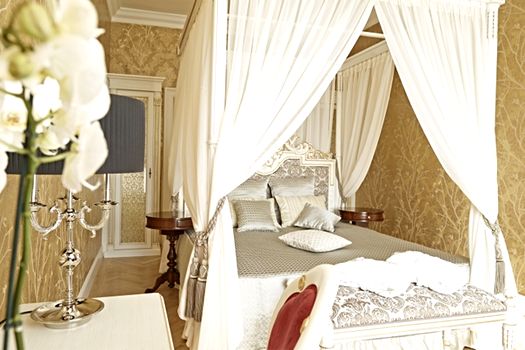 În dormitorul principal este amplasat un pat cu baldachin, sculptat şi înconjurat de tapet nobil auriu şi încrustrat cu pietre strălucitoare. Un coridor îmbrăcat în tapet de Moire face legătura între cele două dormitoare. Masa va fi servită în salonul cu scaune îmbrăcate cu Damast-Ananas, lăcuite în alb şi decorate cu aplicaţii aurite. Uşile vechi existente au fost renovate, iar cele noi adaptate stilului clasic.