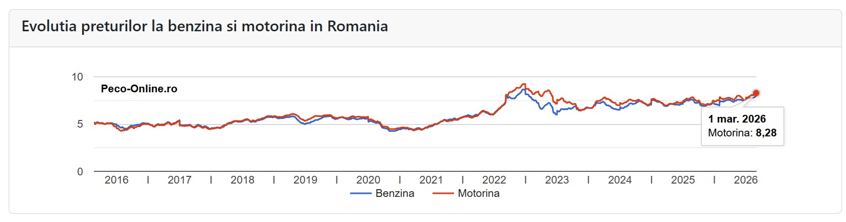Potrivit platformei de specialitate peco-online.ro, comparativ cu luna trecută, prețul mediu al unui litru de benzină s-a majorat cu 2.6%, ceea ce înseamnă că un plin (50 de litri) costă astăzi cu 10.0 lei mai mult decât în urmă cu 30 de zile