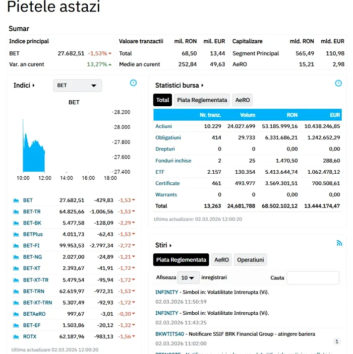 Bursa de Valori București (BVB) a deschis cu aproape toți indicii pe roșu, iar Bucharest Exchange Trading (BET), principalului indice a ajuns la 27.799,80 de puncte la ora 10:15, cu -1,11% mai puțin decât vineri, și la 27.682,11 de puncte la ora 12, în scădere cu -1,53% față de valoarea la care a închis vineri, de 28.112,34 de puncte.