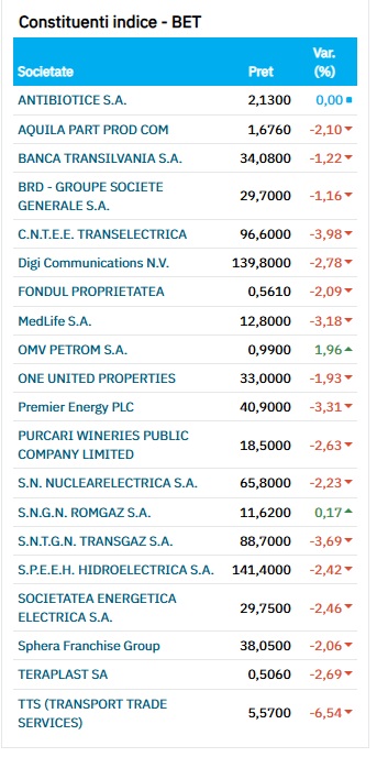 La ora 10:15, din cele 20 de companii din componența BET, doar OMV Petrom era pe plus, cu 3,91%, iar acțiunea Romgaz era stabilă.