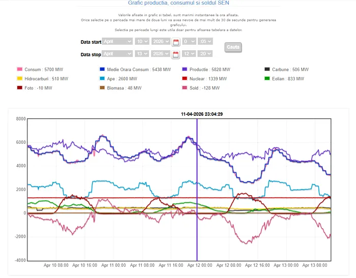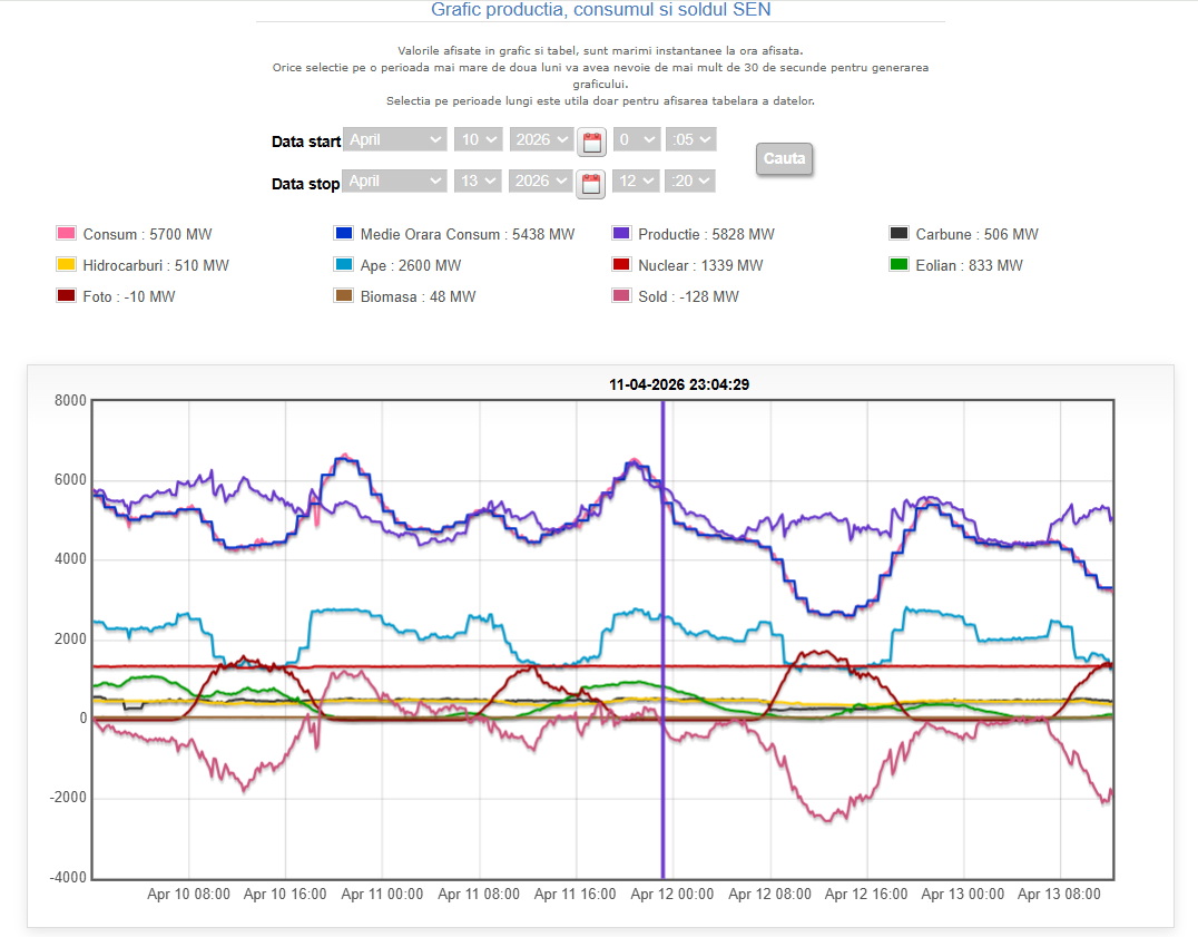 Energia solară contribuia cel mai mult la mixul energetic la această oră (1.379 MW), urmat de producția celor două reactoare de la Cernavodă (1.340 MW) și apoi apele (1.275 MW). Din graficele Translectrica se poate remarca faptul că producția hidro a fost redusă peste zi – când a crescut cea solară – de la niveluri de 2.200 – 2.700 MW în timpul nopții: