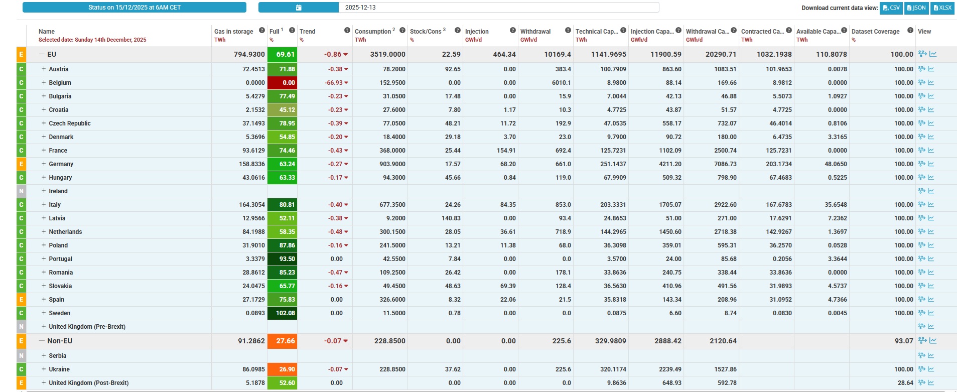 Mai exact, unitățile de înmagazinare ale României – de la Depogaz Ploiești și Depomureș – au ajuns la 85,23% din capacitate, conform celor mai recente date agregate de Gas Infrastructure Europe (GIE), valabile la 13 decembrie.