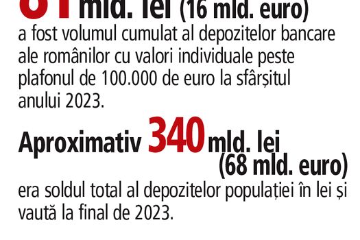 Raportat la soldul total al depozitelor populaţiei în lei şi valută, care s-a apropiat de 340 mld. lei (circa 68 mld. euro) la finalul lunii decembrie 2023, depozitele aflate peste pragul de 100.000 de euro reprezintă aproape un sfert (24%).
