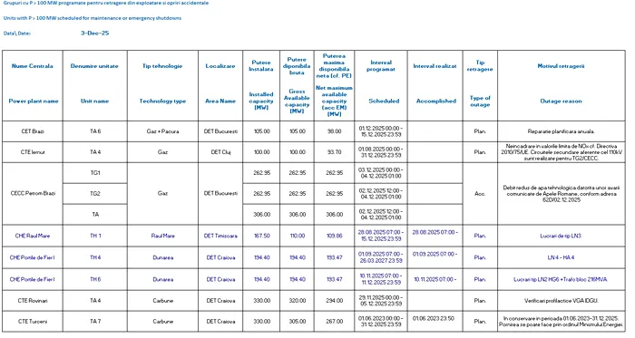„Debit redus de apă tehnologică datorită unor avarii comunicate de Apele Romane, conform adresa 62D/02.12.2025”, se arată în informarea Transelectrica.