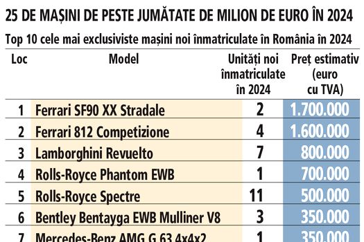 ♦ 175 de automobile de top au fost înmatriculate noi în 2024 pe piaţa locală, volum similar cu cel din 2023, însă anul trecut numărul automobilelor în ediţie limitată sau foarte limitată a crescut, iar dintre cele mai scumpe, 25 costă cel puţin jumătate de milion de euro.