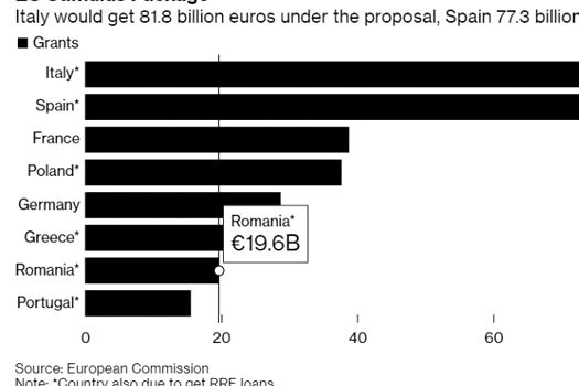 Potrivit Bloomberg, România ar urma să încaseze 20 de miliarde de euro de la fondul de relansare propus de Comisia Europeană. Siegfred Mureşan, europarlamentar, spune că suma totală poate ajunge la 33 de miliarde de euro.