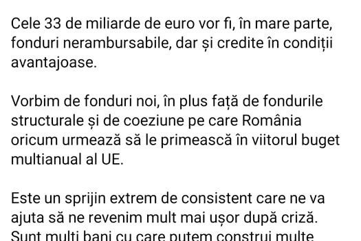 Este un sprijin extrem de consistent care ne va ajuta să ne revenim mult mai uşor după criză. Sunt mulţi bani cu care putem construi multe lucruri bune pentru oameni”, a scris el pe Facebook.
