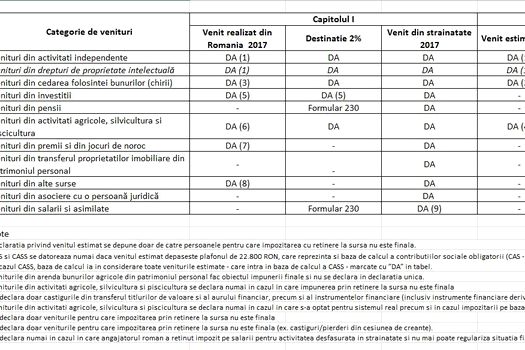 a) identificarea veniturilor care trebuie declarate şi a celor care nu mai trebuie declarate, aspect ce derivă din legislaţia anului 2017 a cărei complexitate influenţează modul de completare a primei părţi a declaraţiei;