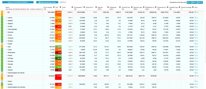 Conform celor mai recente date agregate de Gas Infrastructure Europe (GIE), din 31 martie, România, cu un nivel de umplere al depozitelor de 24,3%, era ușor sub media europeană, de 28,05%, sub țări ca Portugalia (87,52%), Spania (56,93%), Italia (43,74%) sau Austria (34,82%), dar peste Belgia (21,77%), Germania (22,18%), Franța (21,88) și mai ales Suedia (9,94%).