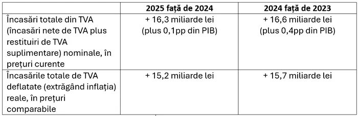 Însă, la o analiză rapidă, observăm că încasările totale din TVA (încasările nete din TVA și restituirile în plus de TVA față de anul anterior) au fost în anul 2025 față de 2024 mai mari cu 16,3 miliarde lei în prețuri curente (plus 0,1pp din PIB), mai puțin decât plusul de încasări totale în prețuri curente din anul 2024 față de 2023, adică plus 16,6 miliarde lei (plus 0,4 pp din PIB). Extrăgând inflația pentru a obține valori reale, observăm încasări totale din TVA mai mari în 2024 față de 2023 (+15,7 miliarde lei) față de cele obținute în plus în 2025 față de 2024 (+15,2 miliarde lei), cu toate că de la 1 august 2025 vorbim despre creșteri consistente la TVA cota generală și la cotele reduse.