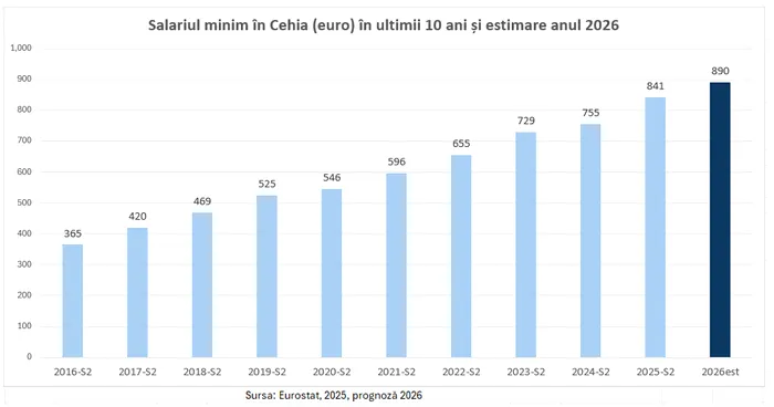 A adoptat recent un mecanism semi-automat: salariul minim să fie 40-45% din salariul mediu. Salariul minim brut în euro a crescut rapid și în Cehia, agregat în ultimii 10 ani plus 131%, de la 365 euro în anul 2016 la 841 euro în prezent, conform datelor Eurostat.Conform mecanismului semiautomat și formulei asociate, salariul minim brut ar urma să crească în anul 2026 la 890 euro, plus 5,8%. Sindicatele solicită în negocieri o creștere la 50% din salariul mediu, adică o creștere la 935 euro. Ministerul Muncii a anunțat propunerea de creștere în anul 2026 la 890 euro. Negocierile nu sunt finalizate.