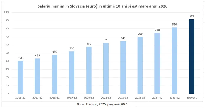 Implementează o formulă (aflată în revizuire în prezent), legând salariul minim de procentul de 57% din salariul mediu. Salariul minim brut în euro s-a dublat în Slovacia în ultimii 10 ani, de la 405 euro în anul 2016 la 816 euro în prezent (+102%). În ultimii trei ani, plus 26%. În 2023 salariul minim a fost 646 euro, în 2024 a urcat la 700 euro, iar de la 1 ianuarie 2025 a crescut la 816 euro. Pentru anul 2026, din aplicarea formulei rezultă un nivel de 857 euro, însă Guvernul a acceptat solicitările sindicatelor, salariul minim stabilit și publicat în Monitorul Oficial fiind 915 euro lunar pentru 2026 (o creștere de 12,2% față de anul 2025).