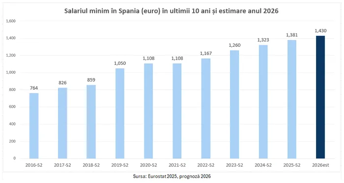 Guvernul spaniol a urmărit explicit creșterea salariului minim către 60% din salariul mediu. După o majorare record de 22,2% în 2019, în ultimii 4 ani Spania a crescut salariul minim brut cu 25%, de la la 1.108 euro brut lunar în anul 2021 la 1381 euro în 2025, ceea ce reprezintă 50% din salariul mediu și 60% din median, respectând astfel principiul european. În ultimii 10 ani salariul minim brut a crescut cu 81%. Prognoza pe 2026 depinde de guvern, dar în condițiile stabilității coaliției de stânga, probabilitatea ridicată este ca salariul minim brut să ajungă la 1430-1450 euro în 2026. În trimestrul doi al anului current, rata șomajului a fost de 10,3%.