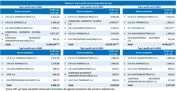 Conform ultimului Raport al Consiliului Fiscal privind Analiza performanței în companiile de stat observăm că Hidroelectrica, Romgaz, Transgaz și Aeroporturi București se află in top companii de stat cu profit net ridicat.