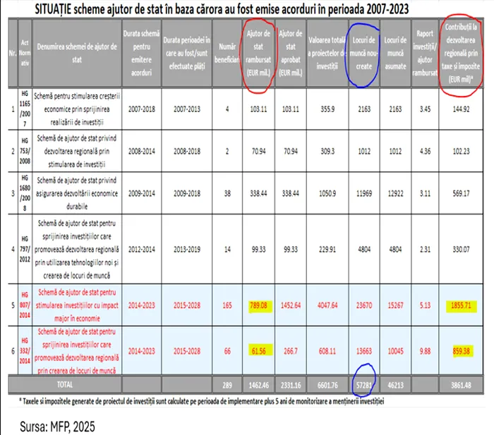 4. Experiența istorică ne arată că schemele de ajutor de stat derulate de MFP au avut un impact bugetar net pozitiv. Balanța ”Contribuția prin taxe și impozite / ajutor de stat rambursat de stat” a fost puternic pozitivă, investițiile realizate cu sprijin prin scheme de ajutor de stat ”întorcând la buget sume mai mari decât cele cheltuite (Schema HG 807 contribuții din taxe și impozite 1,86 miliarde euro / ajutor de stat rambursat 789 milioane euro; Schema HG332 contribuții din taxe și impozite 859 milioane euro / ajutor de stat rambursat 267 milioane euro). Adică au intrat venituri din taxe și impozite la bugetul de stat mai mari de 2-3 ori mai mari decât cheltuiala realizată cu ajutorul de stat rambursat companiilor selectate.