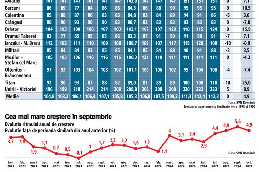 Astfel, media preţurilor în octombrie 2024 a ajuns la 112.308 euro, potrivit Indexului Imobiliar ZF realizat alături de compania de consultanţă imobiliară SVN România, cu circa 80 de euro sub media lunii anterioare.