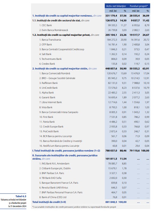Conform celui mai recent raport anual al BNR, la 31 decembrie 2024, activele nete bilanțiere din sistemul bancar românesc însumau 881.848,5 milioane lei, în creștere cu 9,8% față de sfârșitul anului 2023.