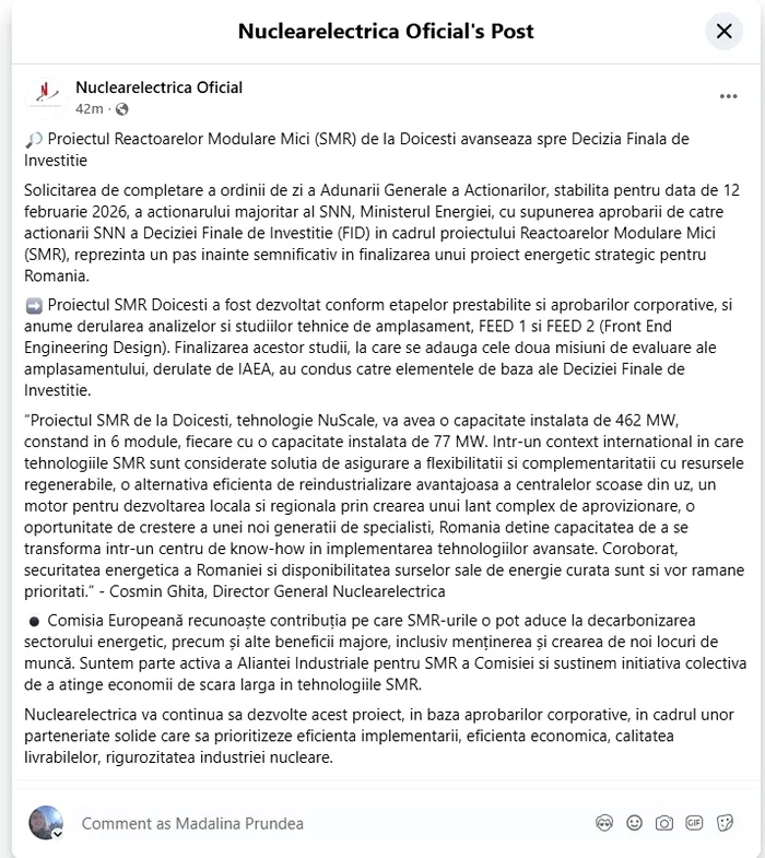 „Solicitarea de completare a ordinii de zi a Adunării Generale a Acționarilor, stabilită pentru dată de 12 februarie 2026, a acționarului majoritar al SNN, Ministerul Energiei, cu supunerea aprobării de către actionarii SNN a Deciziei Finale de Investiție (FID) în cadrul proiectului Reactoarelor Modulare Mici (SMR), reprezintă un pas înainte semnificativ în finalizarea unui proiect energetic strategic pentru România”, se arată în informarea transmisă de Nuclearelectrica, acționar al companiei de proiect.