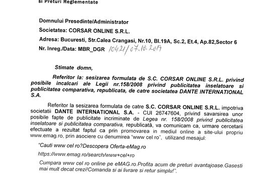 Platforma eMAG, cel mai mare magazin online din România, deţinut de grupul Dante Internaţional, ar fi fost sancţionată de catre ANAF pentru că a folosit între ianuarie 2018 şi iunie 2019 marca înregistrata CEL.ro, încălcând astfel prevederile articolului 6) litera a), litera f) si litera h) din legea nr. 158/2008, potrivit unui comunicat de presă al CEL.ro.