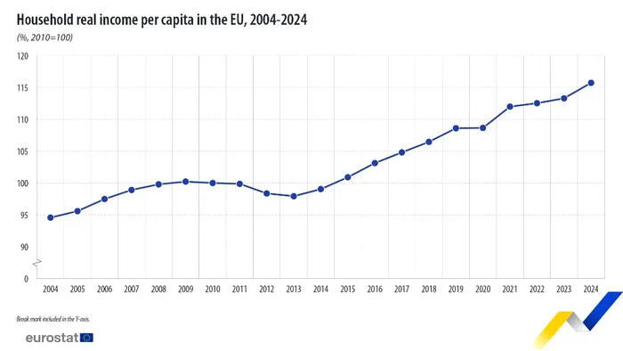 Analizând cronologia Eurostat a ultimilor 20 de ani, observăm un avans solid între 2004 și 2008. Criza economică mondială a adus un punct de cotitură, blocând creșterea veniturilor între 2008 și 2011, urmat de scăderi efective în 2012 și 2013. Din 2014, economia europeană și-a reluat trendul ascendent, întrerupt din nou de contracția bruscă din 2020, cauzată de pandemie. Anul 2021 a adus o revenire rapidă, urmată de o consolidare mai lentă în 2022 și 2023, în timp ce datele preliminare pentru 2024 indică o nouă accelerare a creșterii.