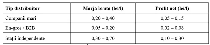 În România, marja brută tipică în anul 2025 este de cca. 0,10 – 0,70 lei/litru  (1% – 7% din prețul final.