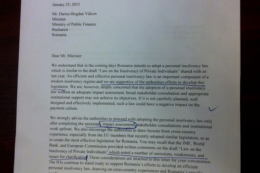 În scrisoare se precizează că actualul proiect privind falimentul personal seamănă cu cel al Legii privind insolvenţa persoanelor fizice, discutat cu FMI şi Banca Mondială (BM) anul trecut.