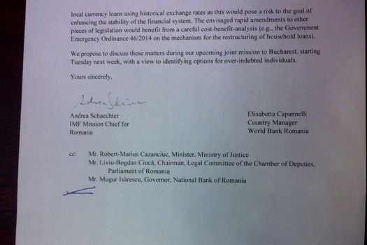 Scrisoarea este semnată de Andrea Schaechter, şefa misiunii FMI în România şi de Elisabetta Capannelli, Country Manger al Băncii Mondiale.