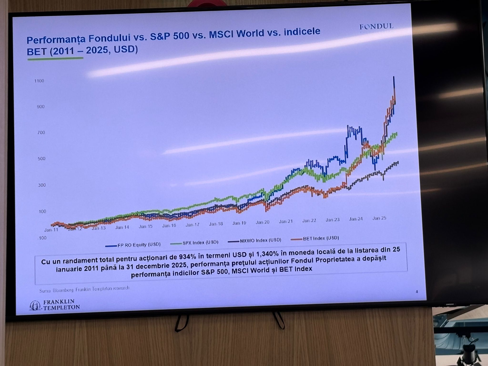 „În ultimii 15 ani și sub administrarea Franklin Templeton, Fondul Proprietatea a contribuit în mod decisiv la dezvoltarea pieței de capital din România, amplificând vizibilitatea internațională a Fondului și a altor emitenți români în fața investitorilor globali. Fondul a fost și continuă să fie un promotor activ al îmbunătățirii standardelor de guvernanță corporativă, al transparenței, al eficienței, al profitabilității și al responsabilității în cadrul companiilor de stat. Suntem extrem de mândri de acest parcurs extraordinar alături de Fond și acționarii săi, și dorim să continuăm drept partener de încredere, consecvent în apărarea intereselor acționarilor și în crearea de valoare pe termen lung pentru Fondul Proprietatea”, a menționat Daniel Naftali, Manager de Portofoliu al Fondului Proprietatea.