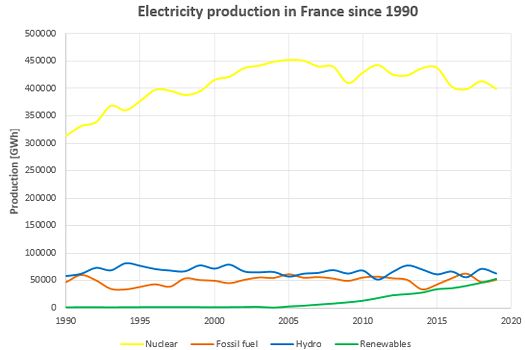 Franţa este, deci, una dintre cele mai ecologiste ţări din Europa având un nivel scăzut de emisii de dioxid de carbon, şi totodată, este una dintre cele mai bogate şi dezvoltate. A renunţat treptat la cărbune şi la gaze naturale, şi intenţionează ca până în 2030 să-şi încurajeze şoferii să renunţe la automobile pe bază de combustibili fosili.