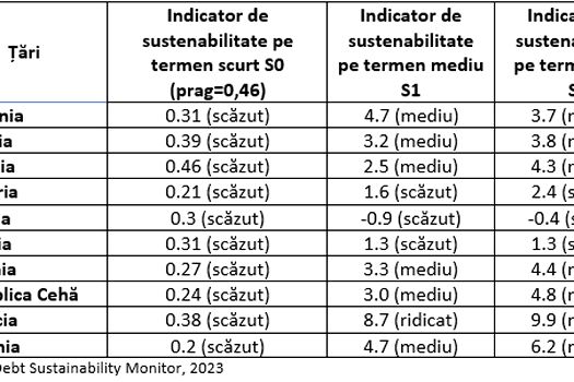 Sustenabilitatea pe termen scurt este calculată pe baza indicatorului S0, valoare ce permite o evaluare a riscurilor fiscal-bugetare pe termen scurt prin agregarea fundamentelor economice din domeniile fiscal şi financiar. În tabelul de mai jos sunt analizate valorile indicatorului S0 pentru România alături de cele 9 State Membre luate în calcul conform Debt Sustainability Monitor 2023. În ceea ce priveşte riscurile fiscale pe termen scurt, România are asociat un scăzut risc, sub coeficienţii de risc estimaţi pentru ţări precum Polonia, Ungaria sau Slovacia. Totuşi, pe sub-componente Comisia Europeană semnalează deficitul bugetar ajustat ciclic dar si soldul bugetar primar.