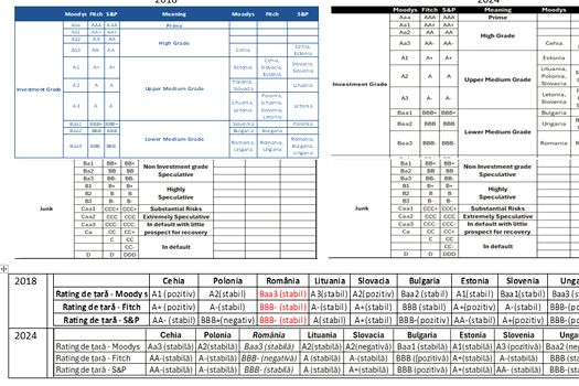 Practic cu toate progresele din perioada 2014-2024 şi pe care le vom detalia mai jos, România a stat / este mai jos cu ratingul / perspectiva faţă de toate ţările ECE şi baltice. De parcă România ar fi stagnat din punct de vedere politic, economic şi social în ultima decadă, fapt contrazis de toate instituţiile internaţionale, statisticile oficiale şi chiar şi punctele tari evidenţiate în rapoartele de evaluare ale agenţiilor de rating.