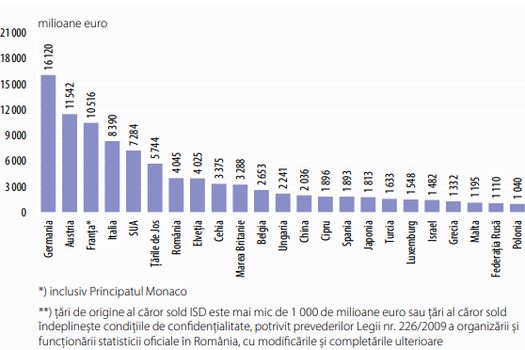 „Germania a reprezentat principalul investitor străin în economia românească, menţinându-şi poziţia dominantă din perioada anterioară. Entităţile rezidente în această ţară deţin, atât în mod direct, cât şi prin intermediul filialelor şi sucursalelor firmelor germane din ţări intermediare, investiţii de 16,120 milioane euro (14,9 la sută din soldul total al ISD). Clasamentul ţărilor investitorilor finali este continuat de Austria (10,7 la sută), Franţa (9,7 la sută), Italia (7,8 la sută), Statele Unite ale Americii (6,7 la sută) şi Ţările de Jos (5,3 la sută),fiecare dintre aceste ţări înregistrând un sold ISD de peste 5 000 milioane euro. Deşi ierarhia principalelor ţări partenere a rămas constantă în comparaţie cu anul 2021, se observă diminuarea contribuţiilor Italiei şi Statelor Unite ale Americii la totalul indicatorului, cu 0,1puncte procentuale., respectiv 1,1 puncte procentuale şi creşterea contribuţiilor Ţărilor de Jos şi Franţei, cu 1,5 puncte procentuale, respectiv 0,1 puncte procentuale. Prezenţa acestor fluctuaţii indică adaptări în strategiile investiţionale ale nerezidenţilor, reflectând, concomitent, evoluţiile economice specifice fiecărei ţări partenere”, se arată în raportul BNR.
