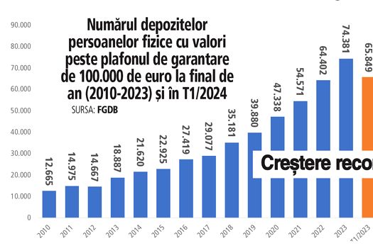 76.746 de persoane fizice care sunt în clubul românilor bogaţi aveau la sfârşitul primului trimestru (T1) din 2024 depozite bancare mai mari de 100.000 de euro, cu o valoare cumulată de peste 82,6 mld. lei (echivalentul a circa 16,5 mld. euro), potrivit celor mai recente statistici ale Fondului de Garantare a Depozitelor Bancare (FGDB).