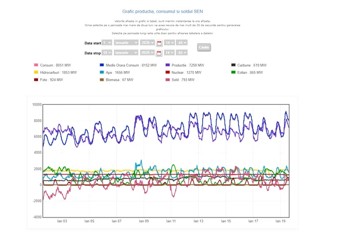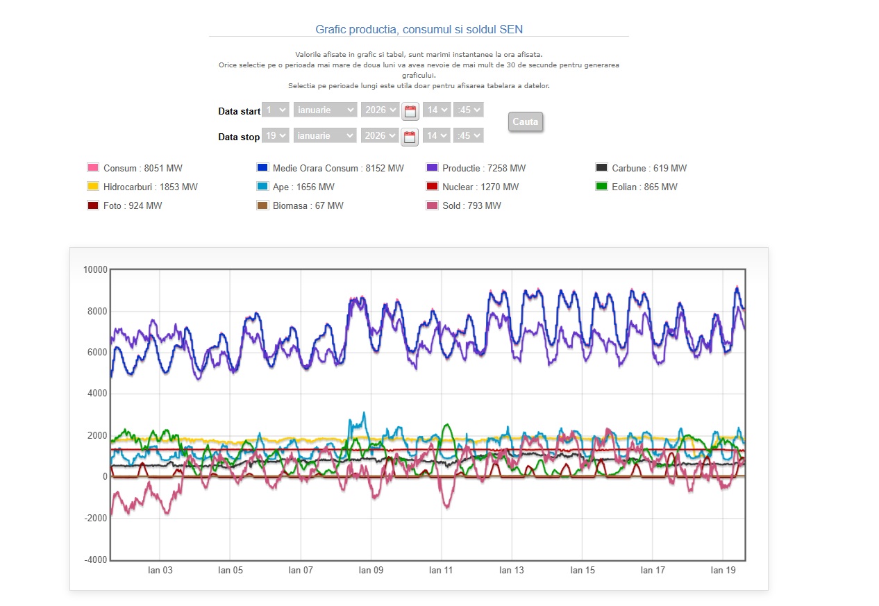 Producția de energie la nivel național era luni, la ora 14:14, de 7.255 MW, din care 1.654 MW, respectiv 22,80%, proveneau de la hidrocentrale. Având în vedere că necesarul de consum a depășit cantitățile generate de producătorii naționali – fiind deficitare cele din soare și vânt – o cantitate de 794 MW a fost importată.