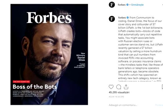 Daniel Dines, în vârstă de 47 de ani, nu a inventat tehnologia RPA (robot process automation), dar deja s-a poziţionat în fruntea clasamentelui al companiilor din acest domeniu. În urmă cu doi ani, atunci când investitorii europeni au evaluat compania la 110 milioane de dolari, UiPath era un start-up mai puţin cunoscut, având doar 150 de angajaţi. Momentan, sediul principal al companiei se află într-un zgârie nori impresionant, situat pe celebrul Park Avenue din Manhattan, New York. Peste 3.000 de angajaţi lucrează acum pentru compania lui Dines, având peste 30 de sedii în întreaga lume, scrie Forbes.